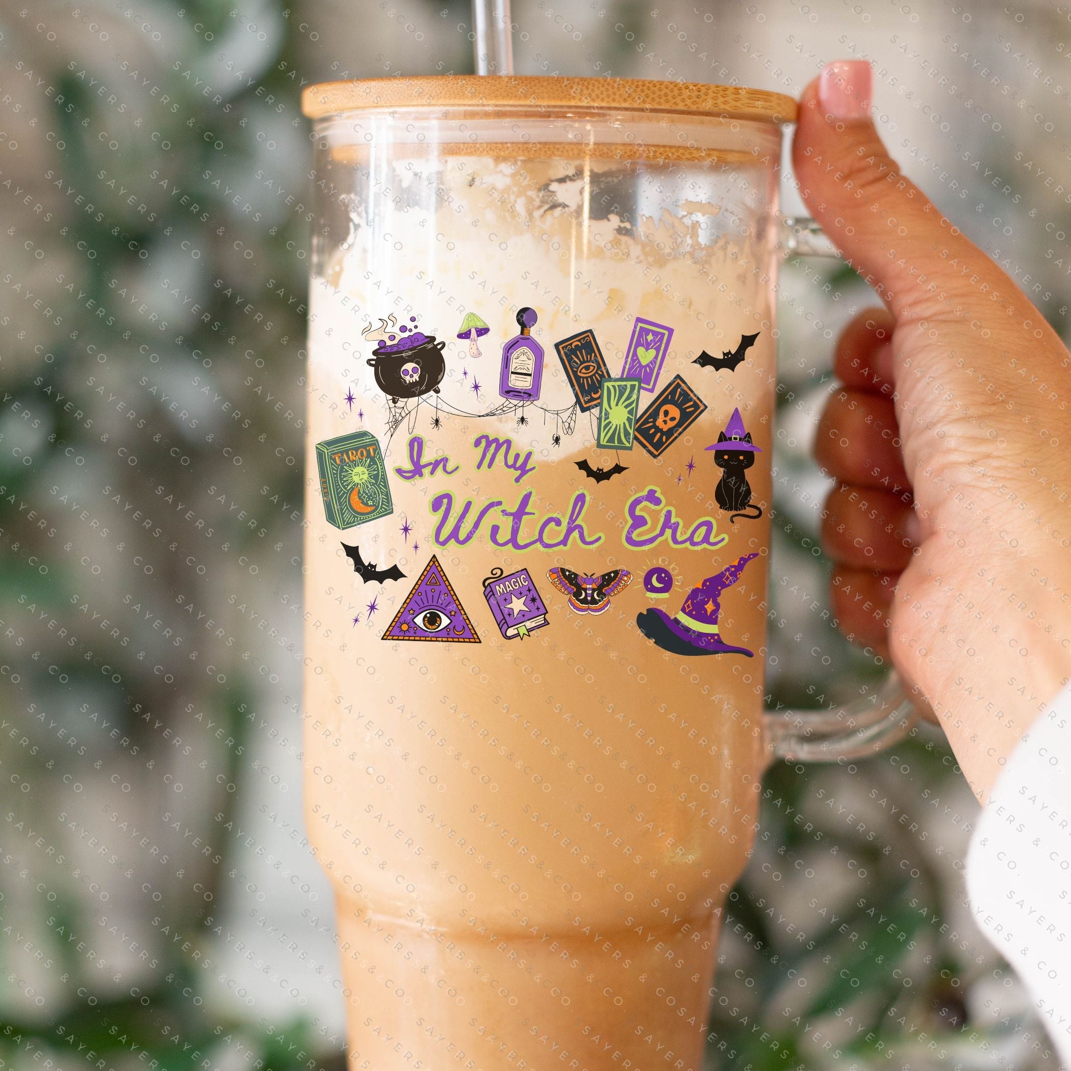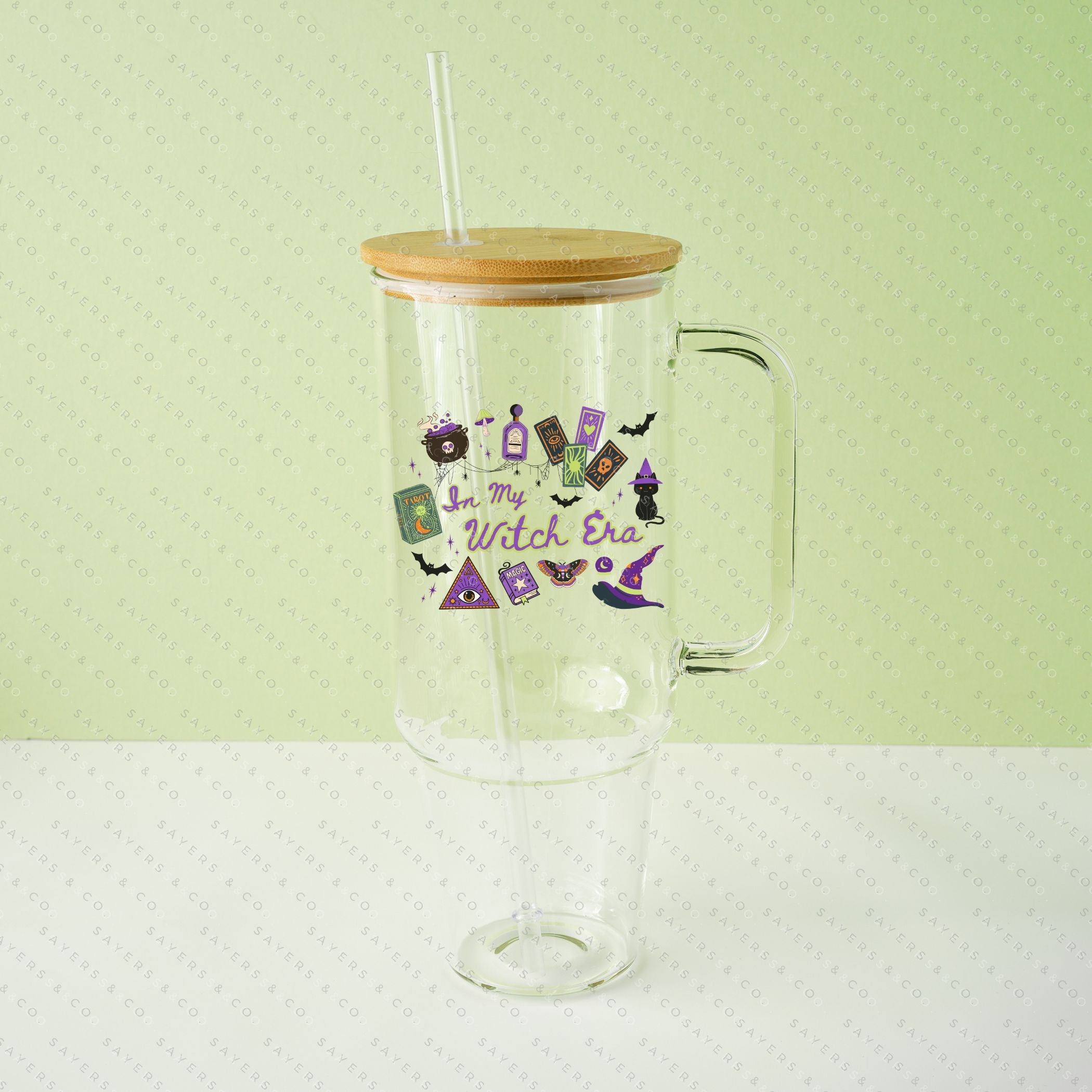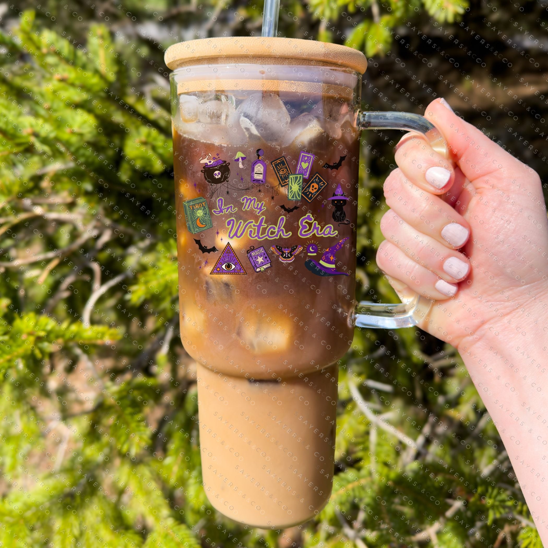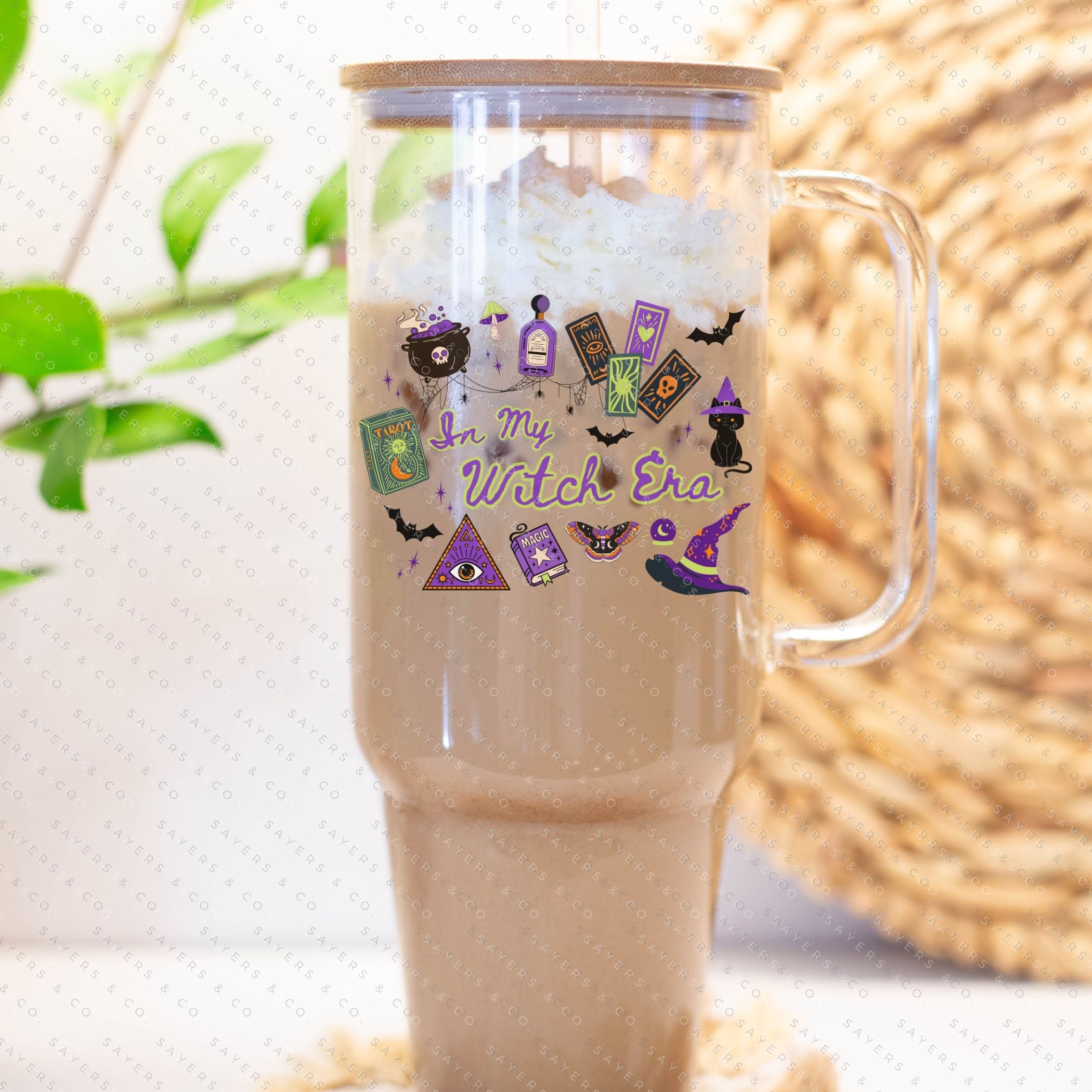 40oz In My Witch Era Green Cup Iced Coffee Glass Can, Witch glassware, witch drinkware, quirky mugs, halloween lover gifts, halloween graphics, unique glass tumblers, novelty cups, fall gift, fall gift ideas, fall themed tumbler, halloween themed tumbler, halloween tumbler, gift for friend, coffee lover gifts, witch Tumbler, witch cup, gift for someone who loves halloween, halloween gift, Mug with Bamboo Lid & Straw #100352