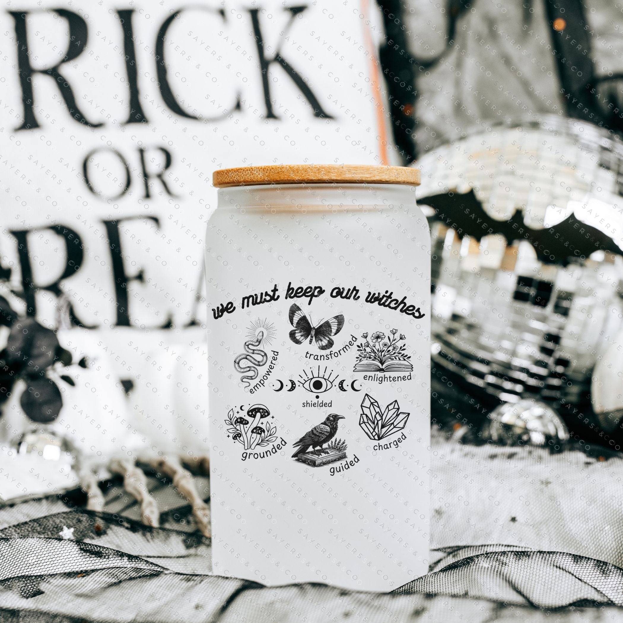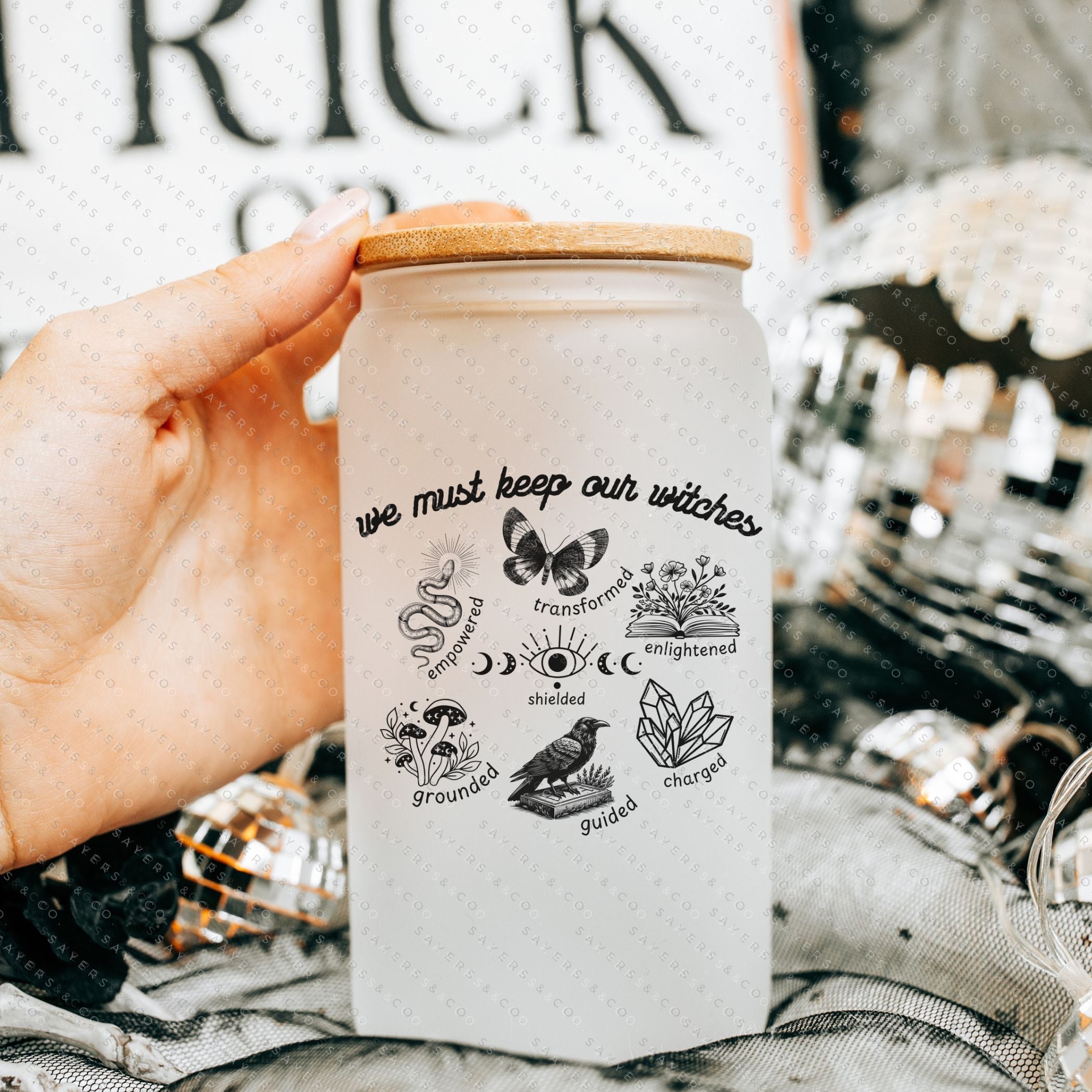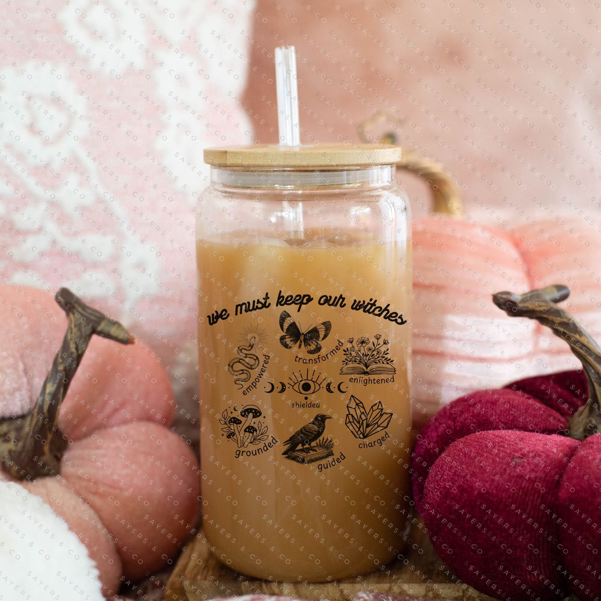16oz We Must Keep Our Witches Cup Iced Coffee Glass Can, witch glassware, witch drinkware, quirky mugs, cute halloween cup, fun halloween tumbler, halloween lover gifts, halloween graphics, unique glass tumblers, novelty cups, fall gift, fall gift ideas, halloween themed tumbler, ghost themed tumbler, gift for friend, spooky season lover gifts, spooky season Tumbler, witch cup, witch tumbler, halloween iced coffee cup, gift for someone who loves halloween, trick or treating gift, witch tumbler, witch lover cup, Mug with Bamboo Lid & Straw #100353